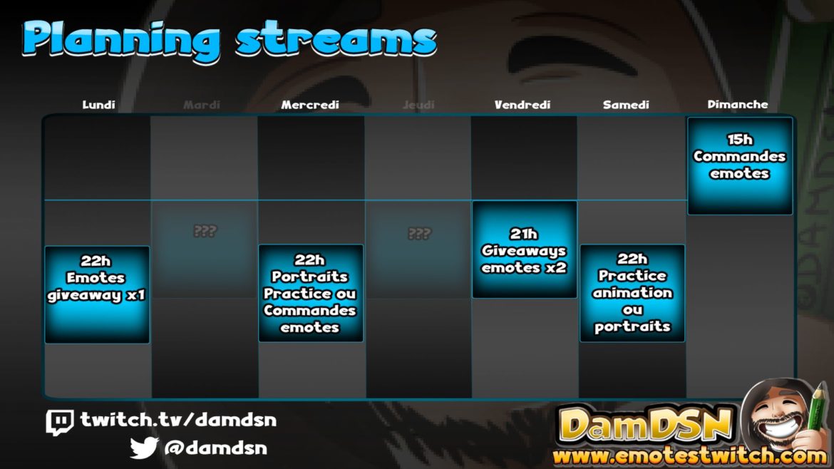 Emotes Twitch planning by DamDSN 10 septembre 2018 written by DamDSN 10 septembre 2018 [:en]Every weeks on twitch: http://twitch.tv/damdsn [:fr]Toutes les semaines sur twitch: http://twitch.tv/damdsn [:] Post Views: 821 affiliateaffiliébadgesdamdsnemotespartnerstreamstreamingtwitch 0 comment 0 FacebookTwitterPinterestEmail DamDSN previous post [:en]August emotes stats[:fr]Statistiques emotes Aout[:] next post [:en]Emotes made for YaraskyGaming[:fr]Emotes réalisés pour YaraskyGaming[:] You may also like PANDA WARS 1 février 2024 Emotes creator tool alpha preview 31 octobre 2021 Recent emotes 24 juillet 2021 Recent emotes 19 juillet 2021 Animated emote Substitution no jutsu 23 mai 2021 Animated twitch emotes 16 mai 2021 Animated gif emotes available 15 mai 2021 New in the shop ANIMATED Emote 15 mai 2021 Magic Skulls emotes 8 mai 2021 Overwatch emotes 1 avril 2021 Leave a Comment Cancel Reply Save my name, email, and website in this browser for the next time I comment. Δ Ce site utilise Akismet pour réduire les indésirables. En savoir plus sur comment les données de vos commentaires sont utilisées.